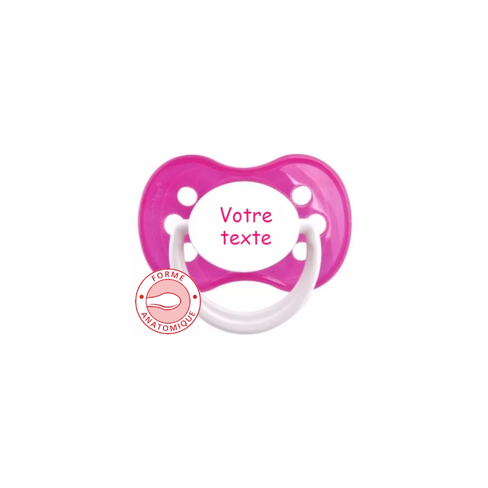 Cette sucette personnalisée est équipée d'une Sucette de haute qualité et s'adapte idéalement à la forme du palais de bébé.