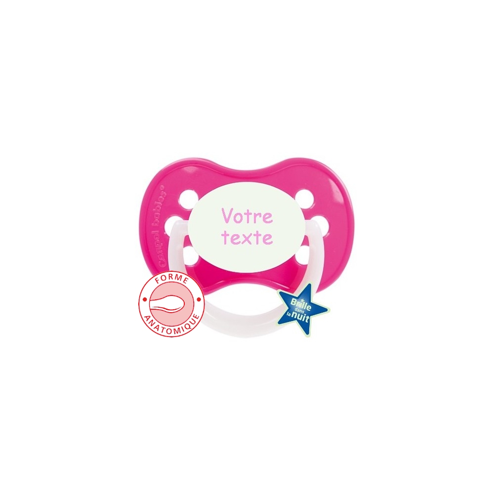 Cette sucette personnalisée est équipée d'une Sucette de haute qualité et s'adapte idéalement à la forme du palais de bébé.