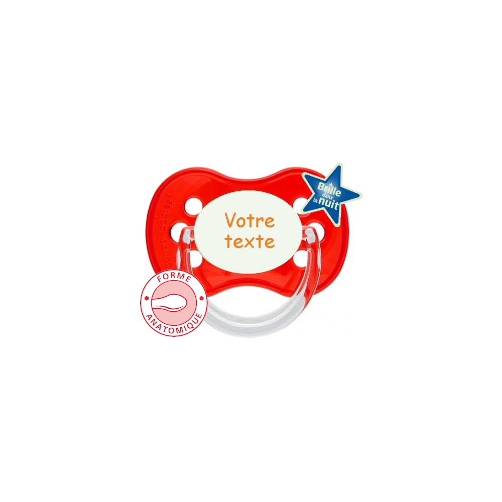Cette sucette personnalisée est équipée d'une Sucette de haute qualité et s'adapte idéalement à la forme du palais de bébé.