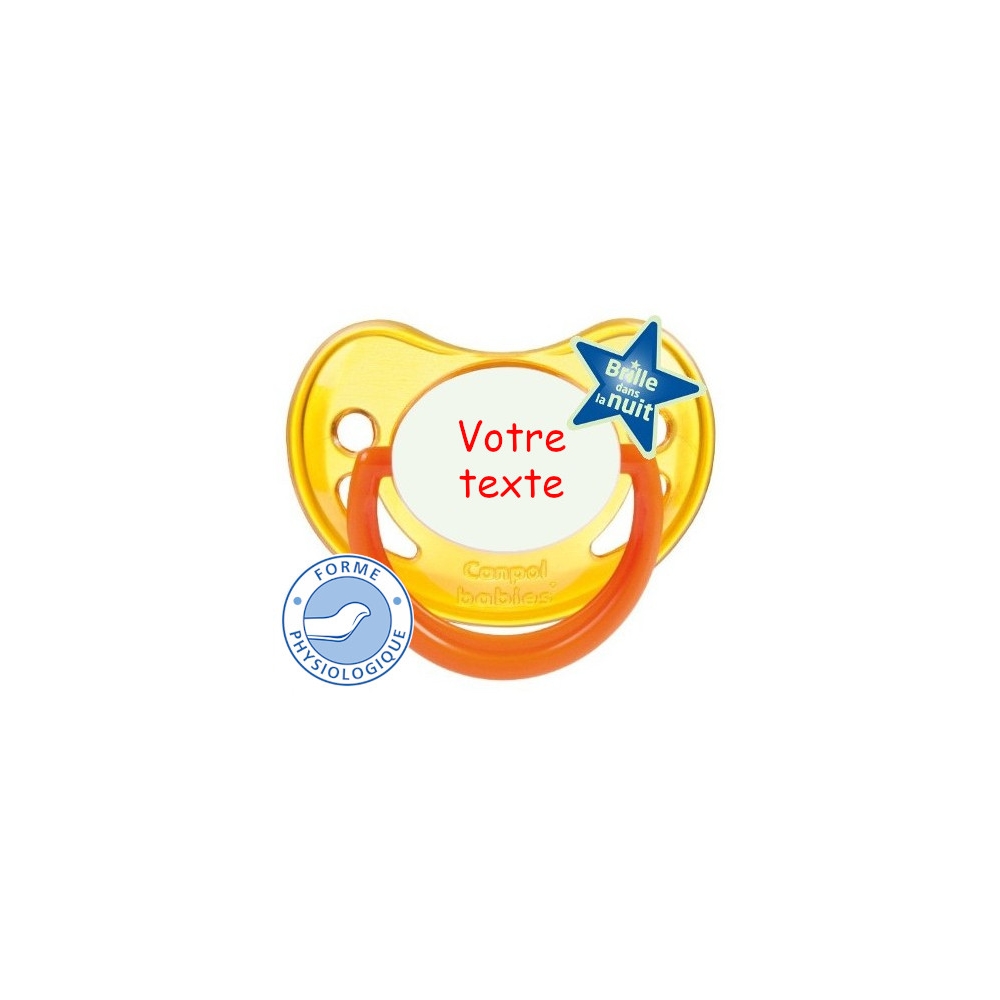 Cette sucette personnalisée est équipée d'une Sucette de haute qualité et s'adapte idéalement à la forme du palais de bébé.