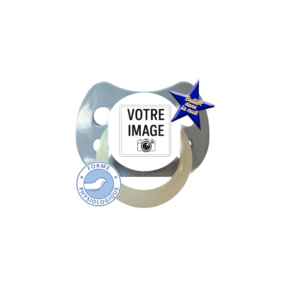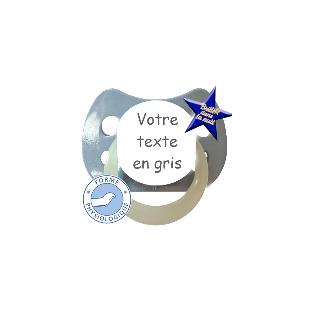 Raffinée, pratique et respectueuse du confort de bébé, la tétine personnalisée MODE gris bleuté fluorescente physiologique associe design moderne et bien-être.